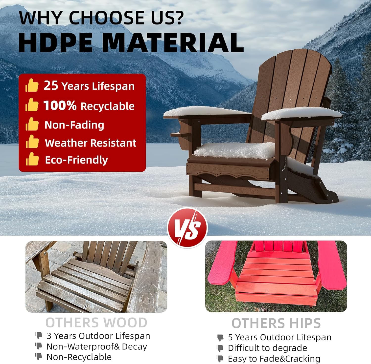 Heavy-Duty & Spacious: Built with reinforced panels and 40 lbs of weight for stability, this HDPE Adirondack chair supports up to 400 lbs. Oversized design features 5" wide armrests, 32" tall backrest, and 22" seat depth for extra comfort.